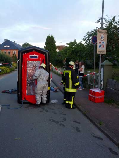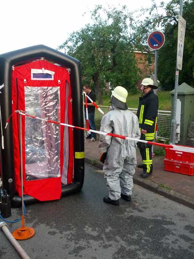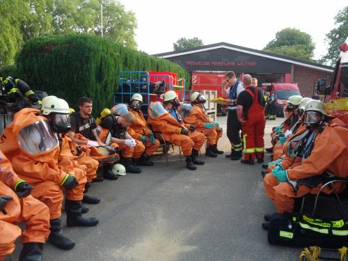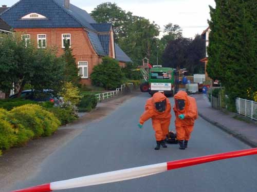 Es handelte sich um eine Alarmübung der Gemeindefeuerwehr Sülfeld mit den Spezialeinheiten der Gefahrguterkundung Amt Itzstedt, der FF Kaltenkirchen und dem ABC Zug des Kreises Segeberg.